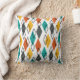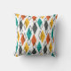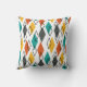 Cet oreiller de lancer a un design moderne du milieu du siècle de diamants en orange, jaune, turquoise, gris, et souligné éparpillé sur un champ de blanc.