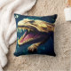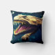 Ce coussin a un dinosaure effrayant représenté dessus.
