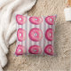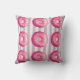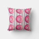 Un coussin avec un carrelage délicieux illustration d'un beigne dépoli rose avec des arroses colorées. Placé sur un motif rayé vintage et abîmé, dans le violet pastel et le rose.