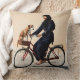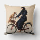 Concept pour le devant d'un coussin à double face : une scène douce d'une mère assise sur son vélo avec son chien attaché avec une corde.