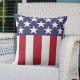 Ce coussin patriotique présente les étoiles et les bandes du drapeau américain en rouge, blanc et bleu.