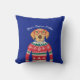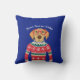 Funny Christmas Holiday Wintry Blue lance l'oreiller avec un chien portant des lunettes rouges et un "laid" Christmas Nordic Sweater. En fait, on pense qu'il est plutôt mignon ! Ajoutez votre texte personnalisé ci-dessus ou supprimez-le. Fait un cadeau parfait Noël et d'hiver pour les amoureux de les chiens. Idéal également pour les vacances White Elephant ou les fêtes d'échange de cadeaux Secret Père Noël.