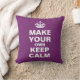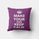 Un modèle d'oreiller jetable dans le style de Keep Calm et Carry On. Le texte de l'espace réservé indique Rendre votre propre calme. Il suffit de modifier le texte dans les zones à droite de l'image et vous pouvez changer le message pour dire ce que vous voulez. Vous n'êtes plus limité à ce que vous pouvez trouver sur le marché - votre imagination est la seule limite! Dans le violet, la couleur peut être customisée en appuyant sur "Customiser plus loin" > Éditer > Arrière - plan.