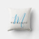 Élégant Ciel Blanc Moderne Bleu Script Monogramme Lancer Oreiller. Un élégant monogramme de script bleu ciel combiné à une police de caractères noir propre san-serif donne un look contemporain.