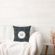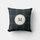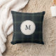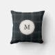 Un oreiller de Noël moderne avec un design intemporel avec votre monogramme sur un arrière - plan bleu marine et vert pâle.