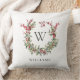 Élégant Monogramme Joyeux Noël Fête Wreath lance oreiller dispose d'une belle couronne rouge et verte de verdure d'hiver avec un festin baies rouges.