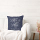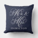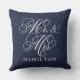 Elégant coussin d'accent carré pour les couples heureux et les jeunes mariés dispose d'un script blanc M. et Mme design avec un texte monogramme personnalisé qui peut être personnalisé avec le nom de famille marié. La couleur arrière - plan bleu nuit foncé peut être customisée pour s'harmoniser avec les couleurs de la maison ou de la chambre.