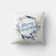 Cet élégant coussin de Noël dispose d'une couronne de rennes dorés et d'une végétation bleue et grise. Joyeux Noël est écrit dans une belle écriture manuscrite.