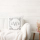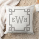 Un élégant coussin gris étain personnalisable présentant un monogramme à trois lettres à l'intérieur d'un cadre de bordure géométrique à clé grecque. Le design subtil gris étain sur fond blanc crée un accent discret et raffiné pour les salons, chambres ou bureaux. Personnalisez avec vos initiales ou le monogramme d'un couple pour un cadeau soigné.