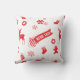 Un coussin avec une répétition transparente et rouge des éléments de Noël - bas, gingerbreadman, flocons de neige, rennes, ornements de Noël, bougies, sapin de Noël, et les mots "Joyeux Noël" - en illustration.