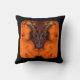 Ce spectaculaire oreiller décoratif à jetons présente un design fractal abstrait d'un esprit vaudou dans les tons rouge, noir, vert et bleu. Ses cornes sont bleues et il est entouré d'un brillant nuage gazeux orange. L'image est répétée à l'arrière.