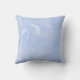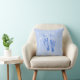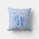Un coussin de faire-part de naissance de bébé avec des empreintes de pas bleues mignonnes contre un doux a marbré l'arrière - plan bleu. Personnalisez en ajoutant le nom de votre bébé au texte personnalisable qui indique : Bébé !