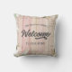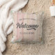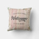 planche en bois rose rustique avec bordure florale et note de bienvenue personnalisée avec monogramme familial