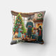 This is an original Habatour Creations festive throw pillow , decorated with an artistic illustration design, featuring a family around the fireplace at Christmas with a decorated Christmas tree