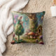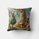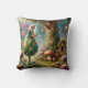 Ce coussin de jet a une illustration aquarelle d'une fée assise sur un artichaut, à côté d'un grand arbre, village fantaisiste, fleurs et papillons.