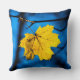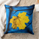 Image d'une seule feuille d'érable jaune sur une brindille contre l'arrière - plan bleu foncé. Un carré unique lance l'oreiller.