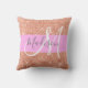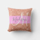 Glam et rose girly, pêche, parties scintillant d'or scintillent le nom de monogramme blanc et l'oreiller de lancement initial. Votre nom personnalisé et votre monogramme sont écrits dans un élégant script écrit à la main avec un arrière - plan rose. Vous pouvez modifier la couleur du texte, le style et la taille de police à l'aide de l'option personnaliser. Un cadeau d'anniversaire ou de Noël parfait !