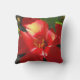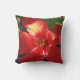 L'image sur cet oreiller extérieur est une photo originale d'une fleur d'hibiscus rouge. Sur la photo, le centre de la fleur est soufflé par un soleil très brillant qui regarde à travers une ouverture entre les feuilles verts jaunes du buisson. L'étamine jaune est entourée des pétales rouges vifs de la fleur, qui semblent jaunes là où le soleil est le plus brillant. Le reste de la fleur tombe dans l'ombre d'une couleur rouge profonde contre les feuilles vert olive.
