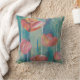 Jetez un bel oreiller avec des fleurs vives de rouge, rose et orange sur un arrière - plan bleu eau. OEuvre originale Fleurs dans la Pluie avec un mélange de collage, aquarelle et pastel.