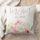 Cette coussin personnalisée présente un thème floral sain. Un bouquet de fleurs roses et blanches est placé au fond. Le titre de maman est imprimé dans une police manuscrite avec l'année établie.