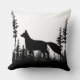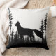 Un coussin de décoration hivernale à la silhouette noire d'un renard rouge dans une paisible forêt de pins, avec un arrière - plan blanc pur.