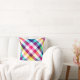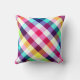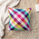 Un oreiller de 16 pouces x 16 pouces avec un motif plaid coloré aux couleurs arc-en-ciel.