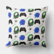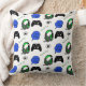 Jeu coussin thématique avec des graphismes en vert citron et noir tels que casques, contrôleurs et niveau de texte vers le haut.