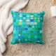 Oreiller carré à motif de bandes de formes géométriques, dans une interprétation moderne d'un motif tribal, dans des couleurs de verre de mer en aqua, turquoise, vert bouteille, bleu de cobalt et blanc quartz