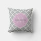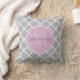 Un carré à motif quadrilatère gris clair girly lance l'oreiller avec un badge à pétoncle dans une lavande rose que vous pouvez personnaliser en ajoutant votre nom et monogrammed initial à. Il fait partie de Harbour Mist Grey and Lavender Pink Spring Collection.