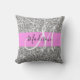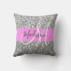 Glam et girly rose et gris / argent parties scintillant scintillent le nom de monogramme blanc et l'oreiller de lancement initial. Votre nom personnalisé et votre monogramme sont écrits dans un élégant script écrit à la main avec un arrière - plan rose. Vous pouvez modifier la couleur du texte, le style et la taille de police à l'aide de l'option personnaliser. Un cadeau d'anniversaire ou de Noël parfait !
