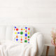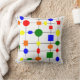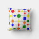 Cet oreiller de lancer a une conception Bauhaus d'une grille avec des formes en rouge, jaune, orange, vert et bleu tracés dessus.