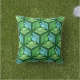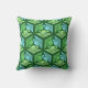 Coussin extérieur dans un kimono japonais classique motif de grues stylisées, arrangé dans un motif d'hexagones, en vert pâle et moyen jade et bleu ciel clair, sur un arrière - plan vert jade foncé