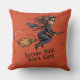Spook up your space with boo-tiful halloween throw pillows for the perfect home decor. This delightful personalized "Broom Hair, Don't Care" throw pillow features a not-so-ugly witch wearing pumpkin earrings riding on her broom with her hair flowing in the wind and she doesn't care it's out of place. It's ideal for those who want a little sarcasm with their spooky. Set against a burnt orange background color with autumn color leaves and stars. This funny halloween pillow can be personalized with your desired text as well as the pillow color.