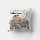 Profitez de ce camion gris vintage moderne et amusant Halloween jetez oreiller! Images aquarelle d'un camion vintage gris avec des citrouilles colorés dans le dos ainsi que dans un panier sur le côté. Un chat noir vigilant marche le long du haut du camion pendant que les chauves-souris volent dans l'air. Un arbre d'automne sans feuilles et une lanterne éclairée complètent la scène. En haut de la typographie d'Halloween orange et noir sont les mots Happy Halloween.