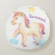 Ce coussin personnalisé par rond mignon superbe a une licorne d'aquarelle avec des fleurs sur sa tête, un arc-en-ciel en nuages et une étoile jaune là-dessus dans une palette de couleurs de pêche en pastel molle, de rose, de pourpre, de bleu et de vert. Ajoutez un nom ou tout autre texte.