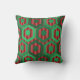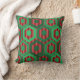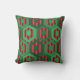 Cet oreiller de lancer a un design géométrique d'hexagones dans quatre nuances de vert sur un champ de rayures dans deux nuances de rouge.