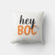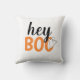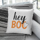 Moderne et mignon "Hey Boo" Halloween décoration maison design coussin avec texte en noir, orange et blanc avec un petit accent fantôme.