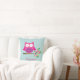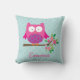 Coussin personnalisé comportant un petit hibou rose de bande dessinée se reposant sur une branche avec le feuille et les fleurs verts de roses indien. Nom personnalisable. Conception d'amusement pour des filles. Idéal pour les cadeaux personnalisables.