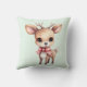 Coussin avec l'illustration d'un adorable cerf de bébé. Grands yeux grands oreilles avec une grande tête et des petits bois bruns. Portant un gros arc rouge.