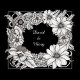 Une illustration en noir et blanc présente un cadre floral entourant les noms "David & Mary". Le cadre est composé de diverses fleurs et feuillages, y compris des marguerites et d'autres fleurs avec des détails complexes de pétales et de feuilles. Les fleurs sont disposées selon un motif circulaire, créant un effet de couronne autour des noms. Les noms "David & Mary" sont écrits dans une police élégante et cursive, centrés à l'intérieur du cadre floral. Le fond est noir uni, ce qui fait ressortir le cadre floral blanc et le texte. L'illustration est enfermée dans une bordure carrée, ajoutant un élément géométrique au design. Le style de l'illustration est détaillé et précis, ressemblant à un dessin à la plume et à l'encre.