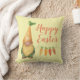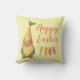 Coussin jeté de gnome de Pâques mignon. Coussin jaune pastel avec un gnome portant un chapeau de carotte. À côté de lui se trouvent les mots "Joyeuses Pâques" dans une typographie amusante et jolie avec une chaîne de carottes colorées en dessous.