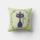 Un chat noir magique, porte un chapeau pointu de sorcière entouré de fleurs automnales et d'un balai. Placé délicatement sur un fond vert menthe. Illustration originale de Noël Snow