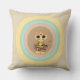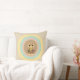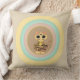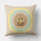 Oreiller de mode avec un joli chat tigre émergeant de cercles pastel multicolores sur fond beige.