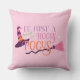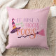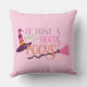 Jolie Sorcière rose Hocus Pocus Casquette Halloween Jouer l'oreiller, Amusez-vous avec des amis et la famille avec ce mignon éffrayant amusant coussin Halloween personnalisé. Le design stylisé de typographie comprend "C'est juste un tas de Hocus Pocus" libellé jaune, violet et rose pastel, orange, broom et sorcière, sorcière casquette, en arrière - plan rose.