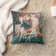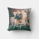 Cet élégant coussin de Noël dit "Joyful" dans la calligraphie moderne en écriture blanche. Ajoutez votre photo de famille préférée et votre nom. La partie inférieure du design, et l'arrière du coussin, est d'une couleur verte festive.