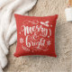 Joyeux & brillant élégante typographie de script blanc, fête rouge de vacances jetez oreiller. Caractéristiques, accents décoratifs de Noël de flocons de neige, de mélodie et de branches.