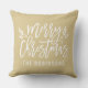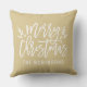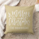 La conception saisonnière de coussin dispose d'un script moderne brossé "Joyeux Noël" avec du texte blanc personnalisé qui peut être personnalisé avec votre nom de famille. Des branches illustrées de feuilles saints et de baies mettent en avant le design. La couleur arrière - plan neutre peut être modifiée.