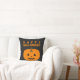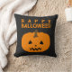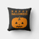 Un Halloween lancer l'oreiller avec un citrouille et un texte 'Happy Halloween' sur le noir. Customisez la couleur arrière - plan noir entre autres options.