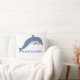 El elemento central es un delfín estilizado representado con un patrón que recuerda al arte, está saltando o nadando sobre un conjunto de olas vibrantes. Los colores predominantes son el azul turquesa, el azul marino oscuro y toques de blanco o un color de contraste, que destacan sobre el tela de otro color a crema, lino o blanco roto del cojín.