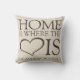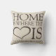 Un coussin doux de famille avec l'expression "à la maison est où le coeur est" et votre nom de famille fait sur commande imprimé dans la typographie moderne avec un regard vintage tustic de ferme. Les lettres sont imprimées dans le brun foncé et l'arrière - plan du coussin est dans un beige naturel léger. Un cadeau unique pour une pendaison de crémaillère ou une occasion de famille.